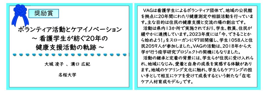 【審査感想】ICTの活用とコミュニティナースの協働は新しい試みで、「こういうのがやりたかった」という声が成果を物語っています。相談室の広がりや住民参加の増加が実を結び、他地域への展開という発展性も感じました。これも、演者や学生ら自らが「待つ姿勢」ではなく、地域のお祭りや農家等に入り込み住民と関係を築き上げていったからこそだと感じます。