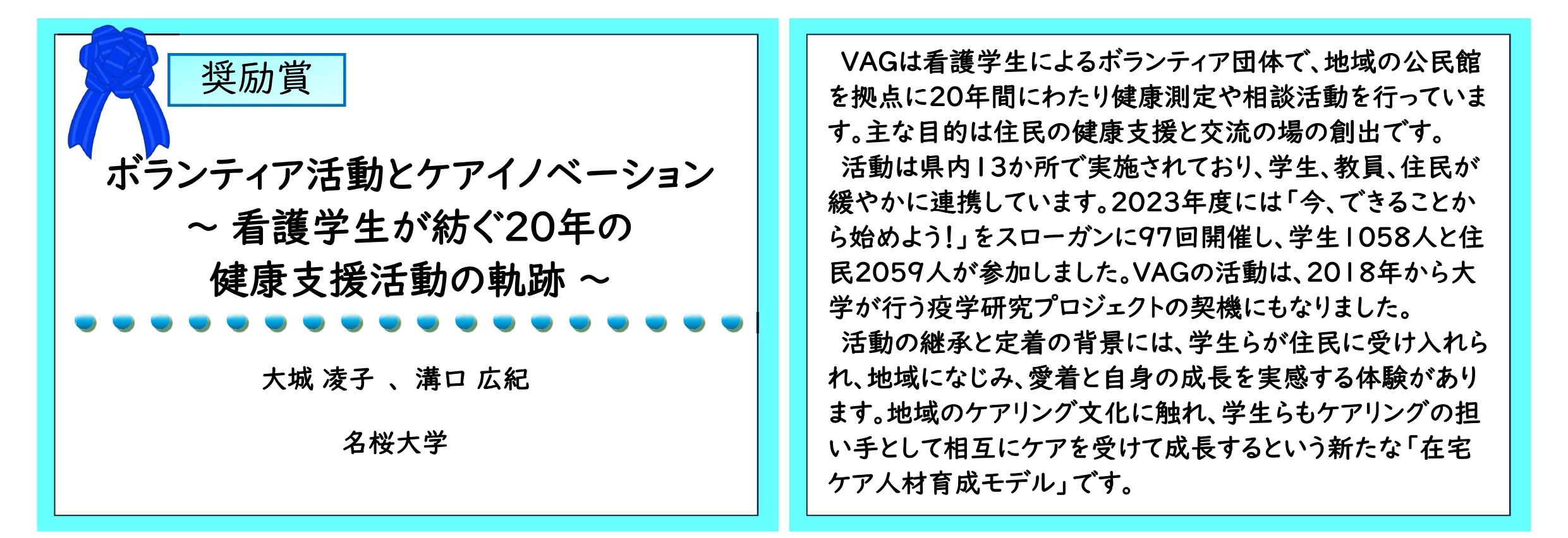 【審査感想】学生が主体となり住民と学び合う場づくりは独創的で、健康づくりと人材育成に成果が見えます。20年にわたる歩みと「ゆんたく力」による緩やかな継続が説得力を持ち、今後の教育カリキュラム化や他地域展開へと発展する可能性を強く感じました。