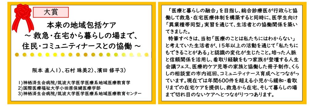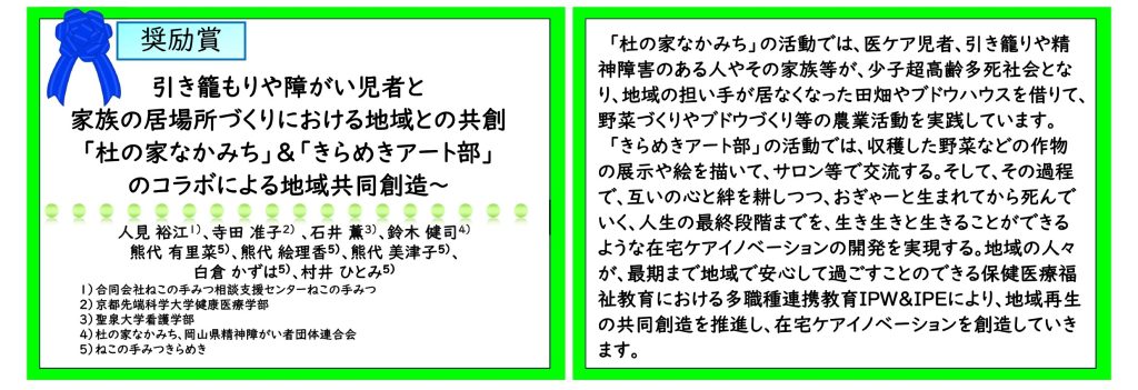 それでは、受賞された在宅ケア活動と審査員の感想をご紹介します。みなさま、これに刺激を受けて、在宅ケアを前進させましょう。