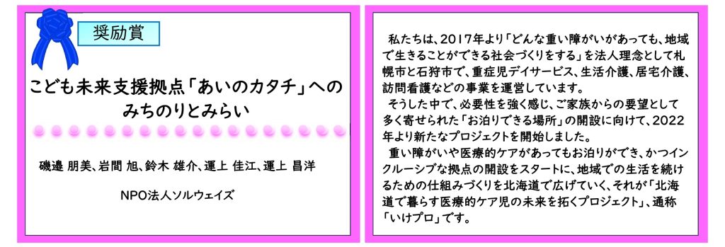 【審査感想】支援を「子どもの権利」という視点から組み立てていることに深い意義を感じます。現場で確かな成果を上げており、成人期まで広がる発展性も期待できます。理念と実践が響き合っている点に強さを覚えます。